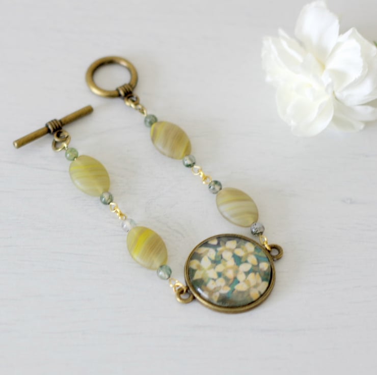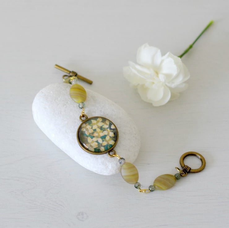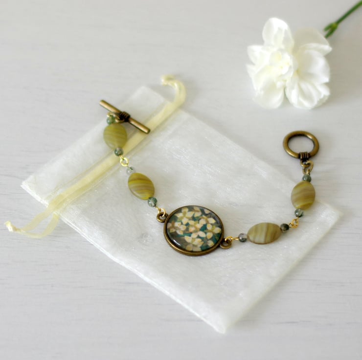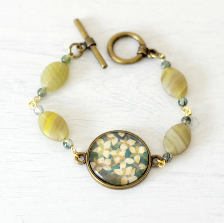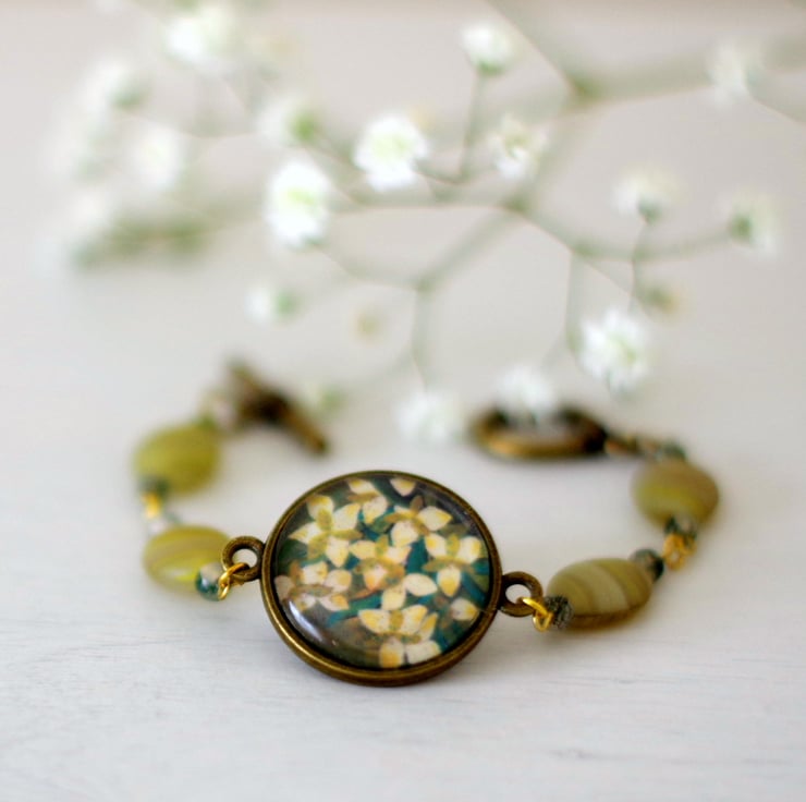 I made this feminine bracelet using a floral art print after one of my original paintings, green agate and green obsidian and bronze/gold connectors. The image is printed at home on 270 GSM artist satin paper and then fixed under the glass cabochon and onto the bronze setting. The glass cabochon is 1" round and the bracelet is approx 7.6".