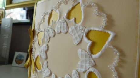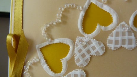 A completely handmade and uniquely designed card. Consisting of a design of three circles of hearts embossed and cut from parchment. The outer circle outlined with clear glass beads. The middle circle cut out and the inner circle embossed with a chequered pattern. Mounted onto gold vellum and then onto quality cream card. Finished off with gold ribbon and bow