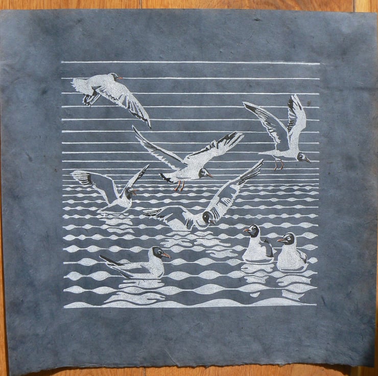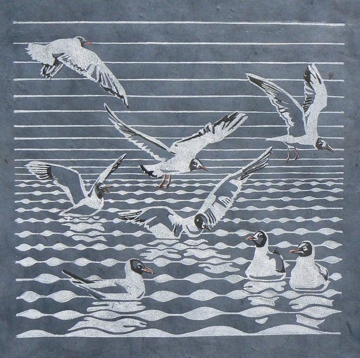 The gulls are hand printed in two layers and hand finished, and the image measures 24cm square on paper minimum 30cm square. Each print is slightly different.