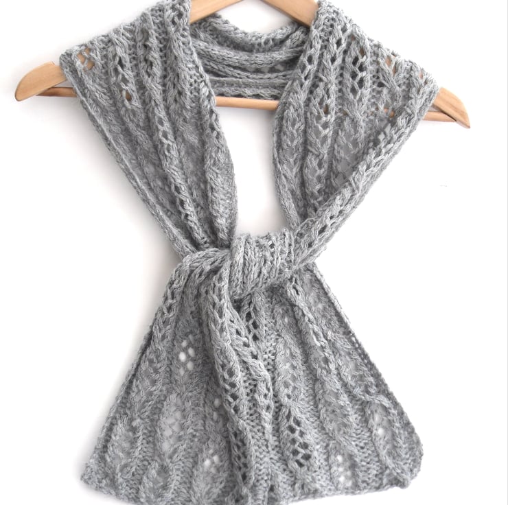 Wonderful soft scrumptious scarf. Hand knitted grey neck scarf in a modern cable lace design. Its been knit in a beautiful baby alpaca yarn (80% baby alpaca , 8% merino wool , 8% nylon) , a soft mottled effect colouring and beautifully soft to the touch
