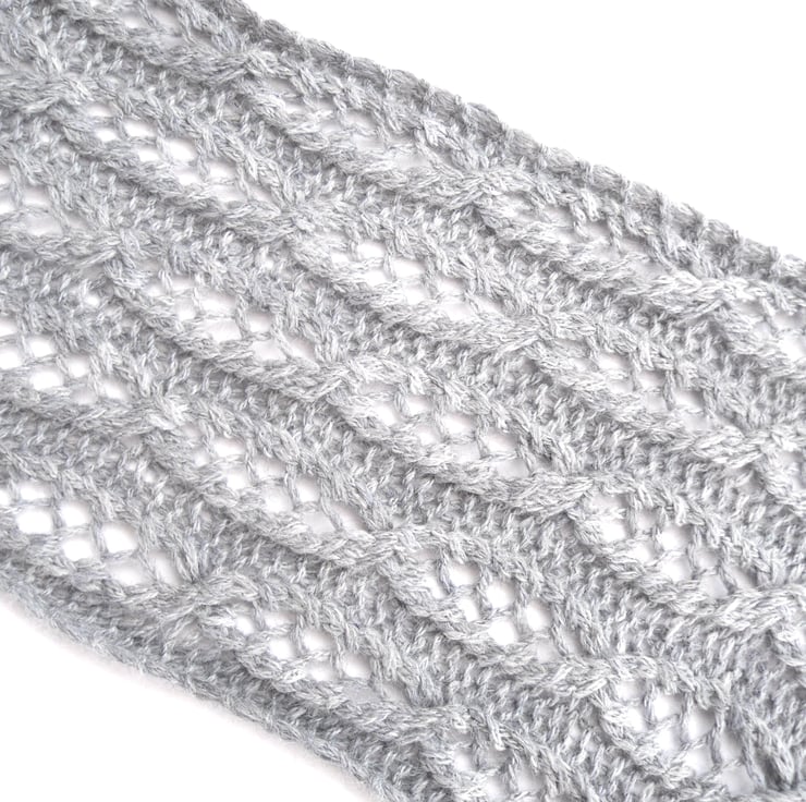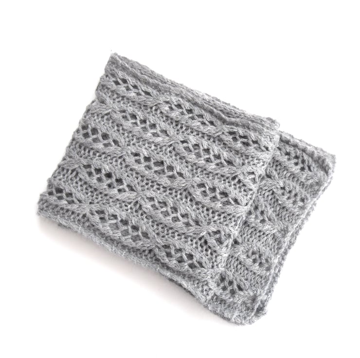 Wonderful soft scrumptious scarf. Hand knitted grey neck scarf in a modern cable lace design. Its been knit in a beautiful baby alpaca yarn (80% baby alpaca , 8% merino wool , 8% nylon) , a soft mottled effect colouring and beautifully soft to the touch