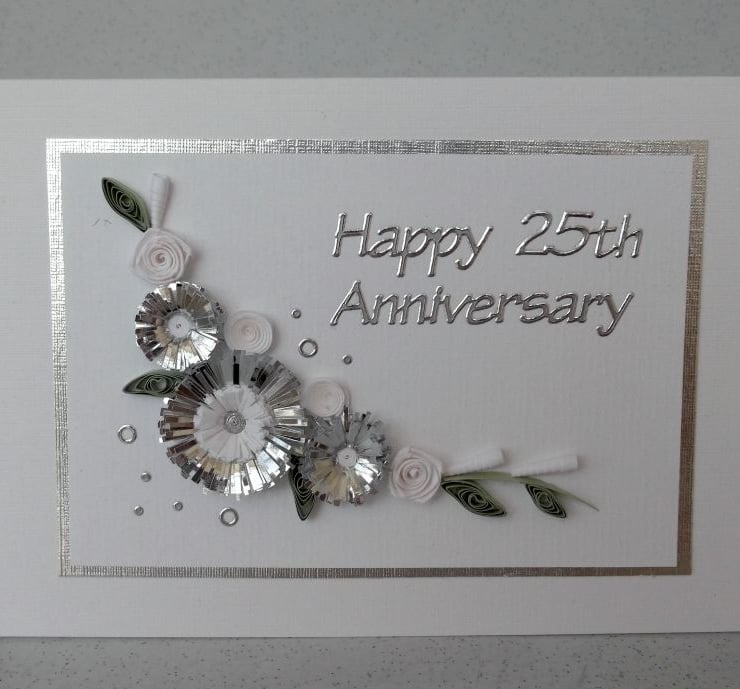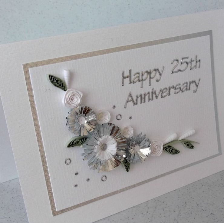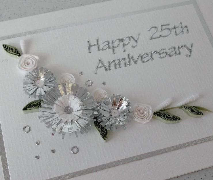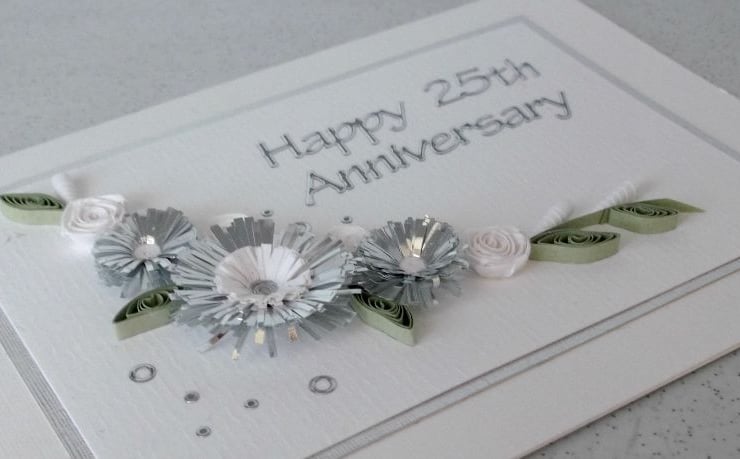 A beautiful handmade quilled card for a 25th silver wedding anniversary, with quilling flowers in silver and white. Perfect for helping a special couple celebrate their memorable anniversary.