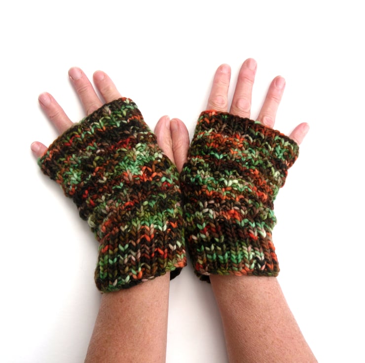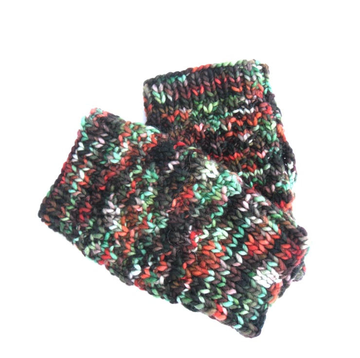 multicoloured chunky fingerless gloves / hand warmers in bright autumnal colours.