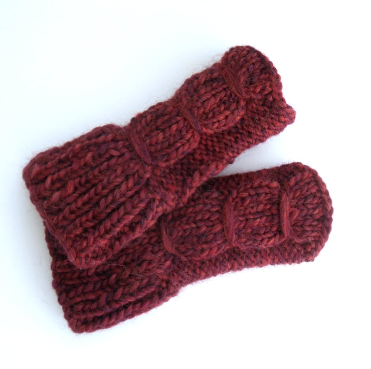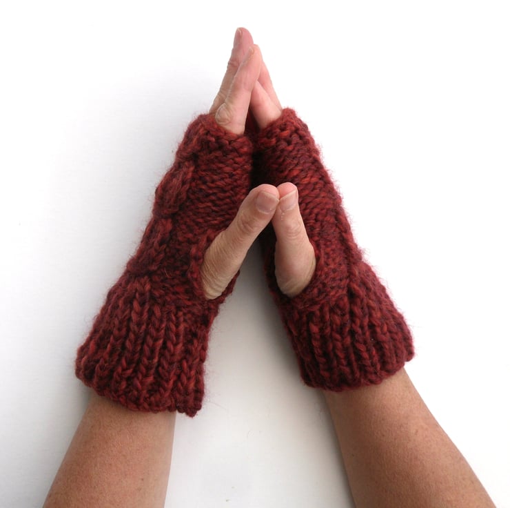 Maroon chunky hand knitted fingerless gloves. Plain knitted ribed cuff with a centre feature mock cable pattern running the centre of each glove. Hand knitted in a 100% wool yarn. Great warming gloves!