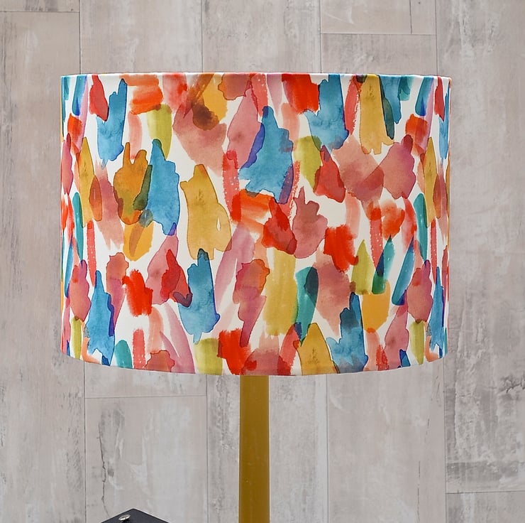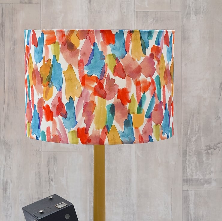 This lampshade features a beautiful fabric. The fabric has splashes of red, blue, mustard and green on a white fabric. The shade has a stand out feel and will compliment the decor and the light has a luxurious feel. If you would like a swatch of the fabric please send me a message.