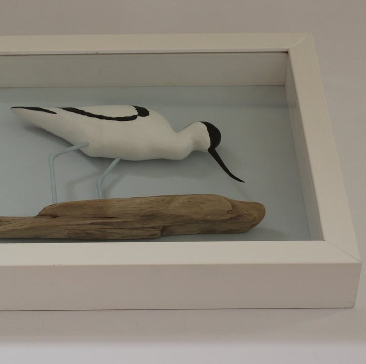 This box frame contains a hand carved avocet. It has a delicate curved bill and glass eye and has been painted with artists acrylics and has been waxed to give a soft shine. It is mounted on a piece of driftwood and attached to a pale blue back board. The frame is a soft white and is 11" x 9" and 1.5" deep approx. It is wall mounted.