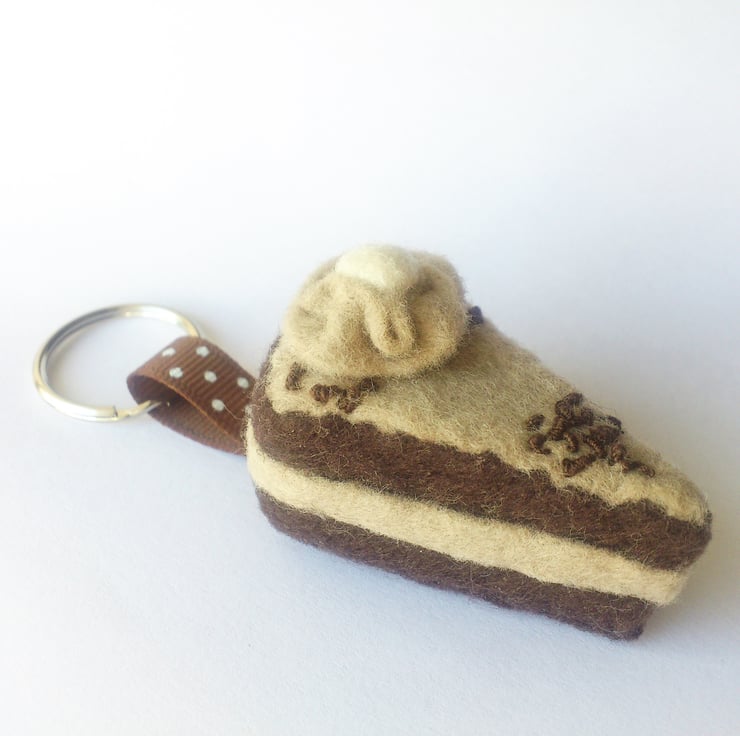 A fun and realistic looking chocolate fudge cake keyring or bag charm designed and handcrafted by Lily Lily Handmade. This chocolate cake key charm is a slice of chocolate cake decorated with a swirl of chocolate fudge frosting, chocolate curls and a white chocolate ball. All carefully hand sewn using felt.