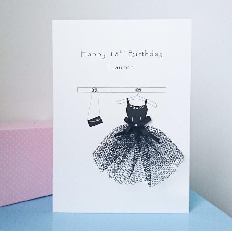 A stylish personalised birthday card featuring an elegant little black dress, designed and handcrafted by Lily Lily Handmade. The dress and matching black handbag is embellished with small diamante rhinestones.