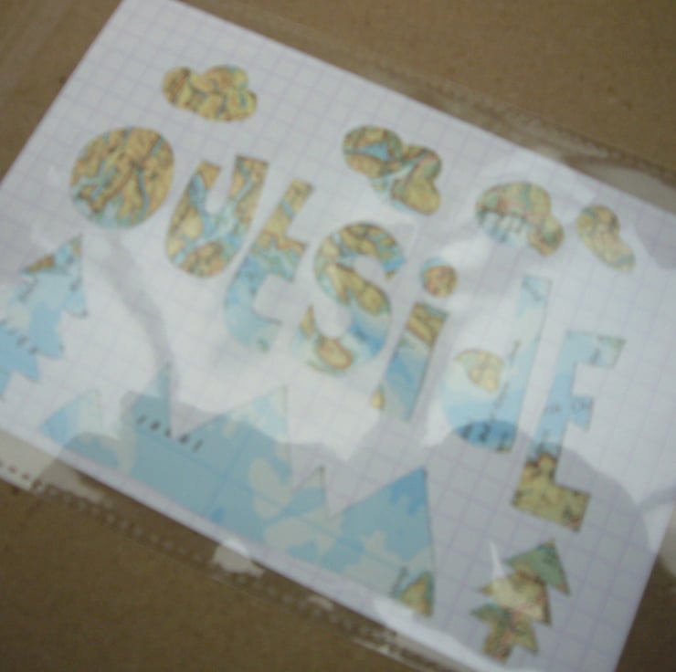 Sent from UK - handout phrase "outside" using card and backed with hand cut card background to emphasise the phrase