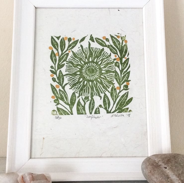 This simple print has been hand printed with green printing inks on beautiful handmade Indian paper. the prints have also been hand tinted with watercolour paints and part of a limited edition of 50 prints.