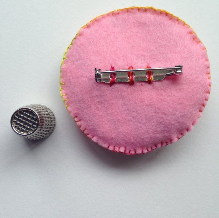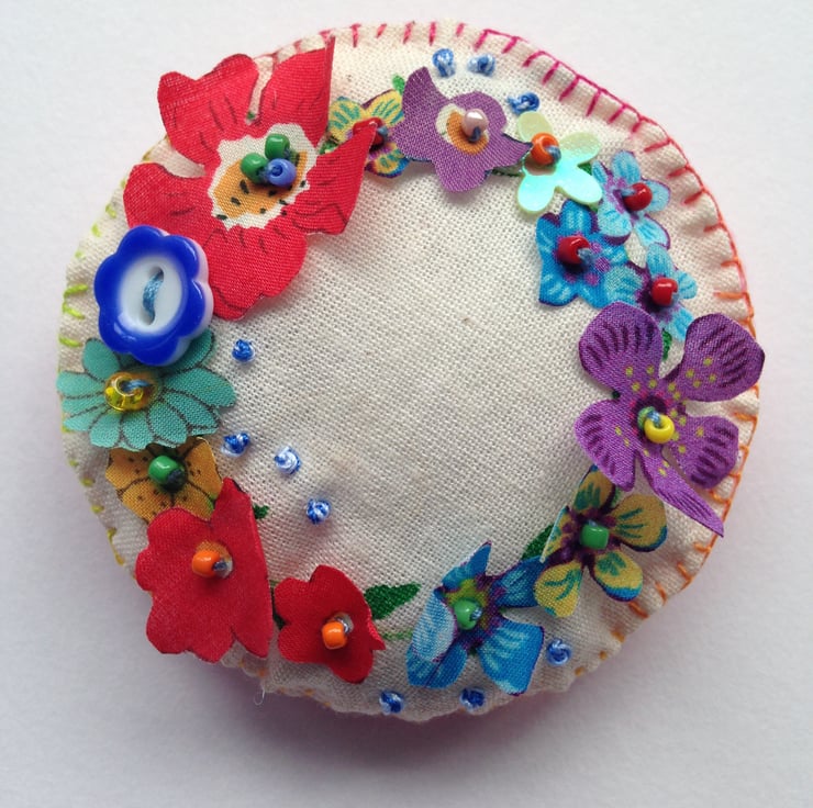 This brooch has been designed and hand-stitched by me.I have painted a leaf wreath with fabric paints and then have cut flowers from fabric, mainly by Liberty. I have then sewn them in a circle and decorated them with seed beads, French knots and the odd sequin and button. The background material is cream linen and and the circle has then been blanket-stitched to a pink felt backing with a small amount of stuffing and a small piece of circular card inside to give a bit of stiffness. I have then stitched a safety brooch pin on the back.