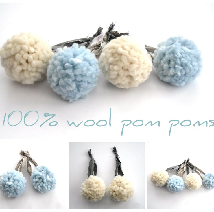 Set of 2 pom poms in 100% wool. These poms poms are ideal for hanging ornaments around door and drawer handles. Would suit child's bedroom , the nursery or your bedroom / bathroom