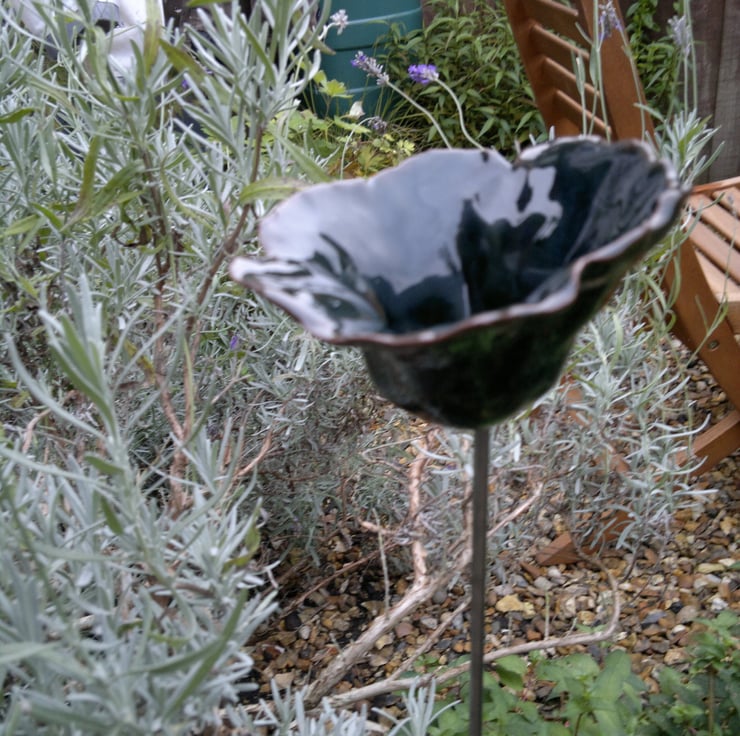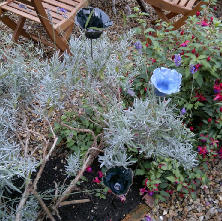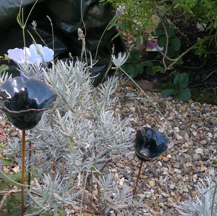 Handmade ceramic flower heads made with Terracotta clay and different coloured shiney galzes. Flower heads have steel stems attached so they can be used outdoors in the garden.