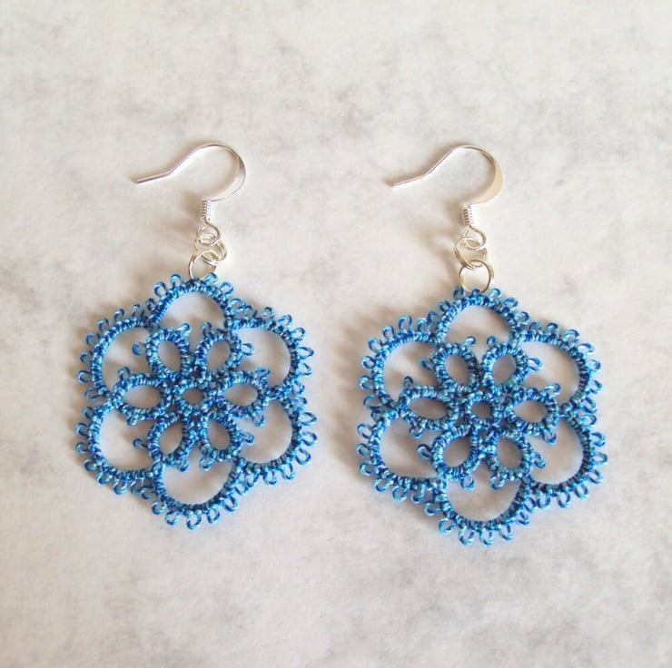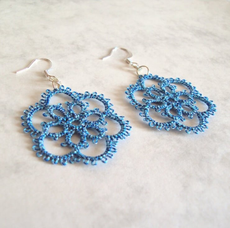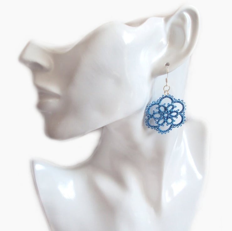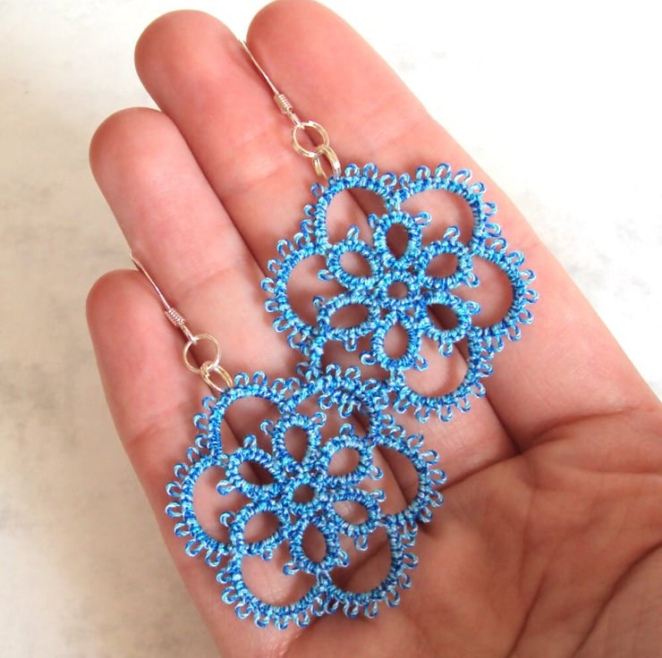 Made to order: please allow 2 days for completion of item. These lacy dangle earrings have been carefully created, using the old lace-making technique of tatting, in high quality multi blue cotton thread. I love this thread. It reminds me of jeans fabric when tatted up.