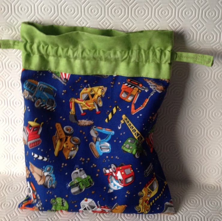 This drawstring bag is made using trucks and diggers design cotton fabric. It has a contrasting top and lining. The bag is useful as a small shoe bag or to carry those precious bits and pieces!