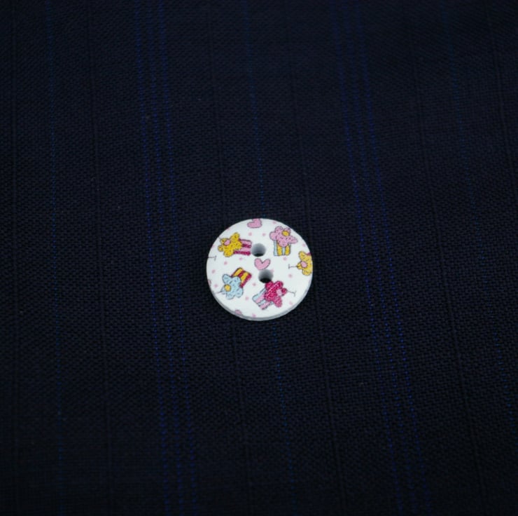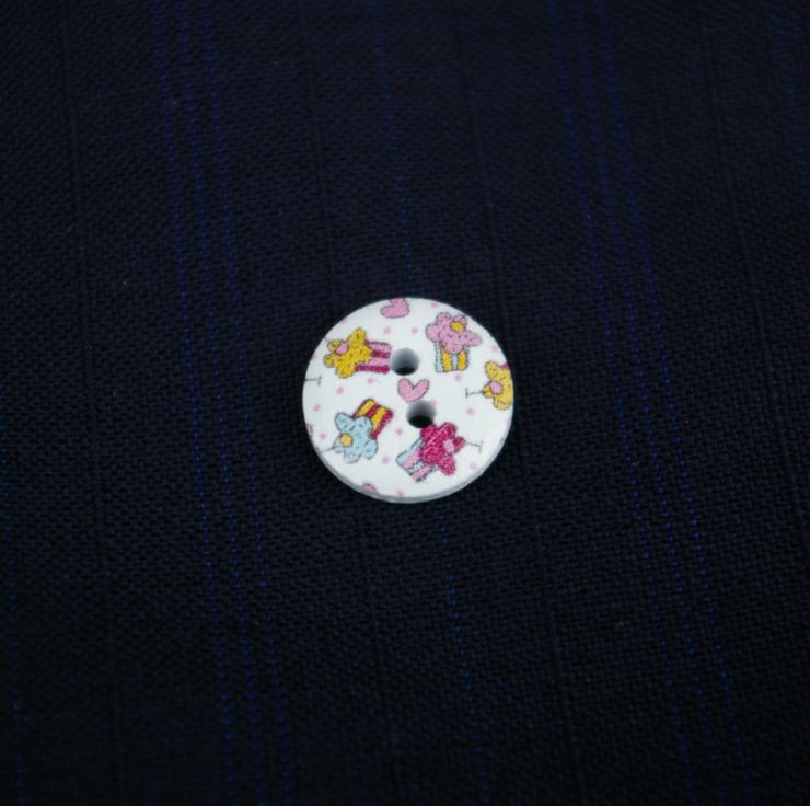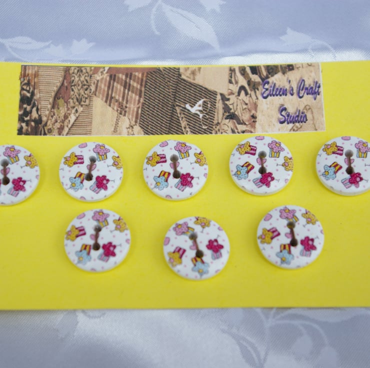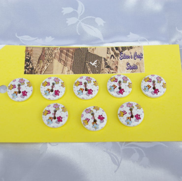 Set of eight buttons. Each button depicts a series of colourful cup cakes on a white back ground. The buttons are made from wood and contain two sewing holes. They are plain white on the reverse side.