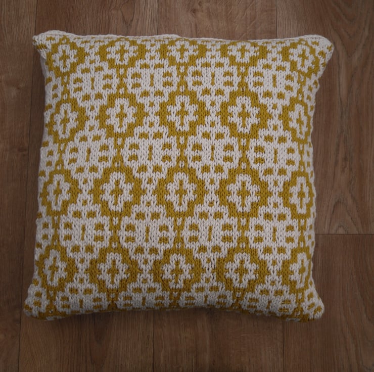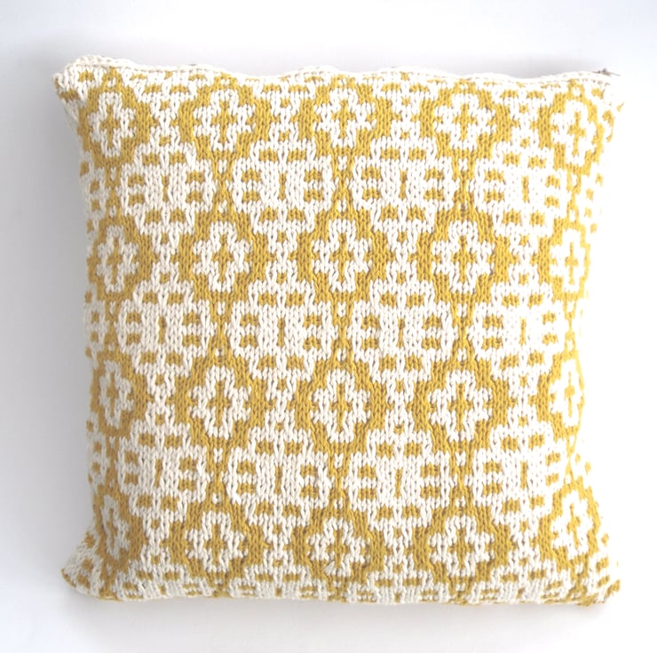 Mustard yellow and cream cotton cushion cover / throw pillow in a large size. Hand knit in a stunning mosaic (slip stitch) honey pot pattern using a cream and mustard 100% cotton yarns.
