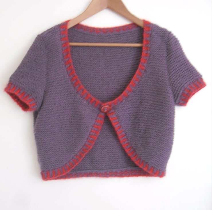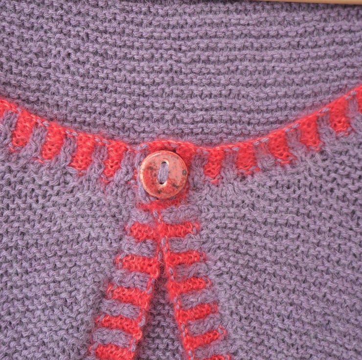 Gorgeous purple hand knit cardigan. Knitted in 100% cotton with stunning eye catching edging detail in red in kidsilk haze , giving it a slight fluffiness around the edges.