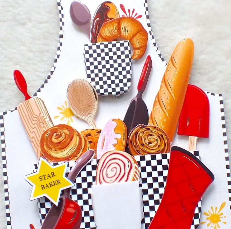 Do you know a 'Star Baker'? Say a special happy birthday with this 3D, apron shaped card. Embellished with baking equipment and lots of treats - donuts, croissants, buns and bread. Approx. 7"x5" in size, it has been left blank on the reverse for your own message.