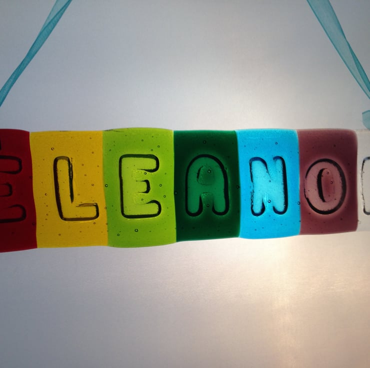 These beautiful fused glass name panes are made to order for names of up to 9 letters long. A coloured glass tile measuring 5cm x 3cm is cut per letter, with the overall length of the piece depending on how many letters are required.