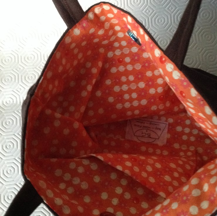 This bag is made from brown faux suede and a multi coloured tweed fabric. It has a magnetic closure and is full lined with an orange cotton fabric. There is an internal pocket made from the lining fabric.