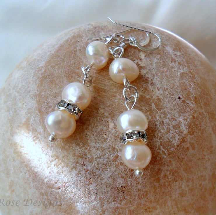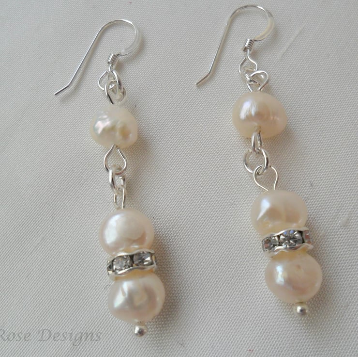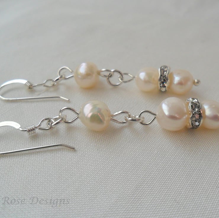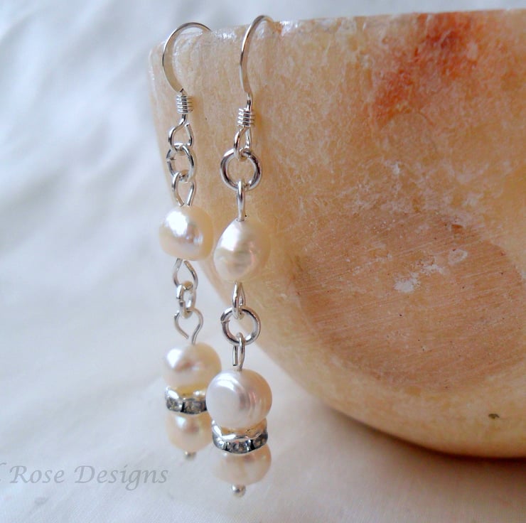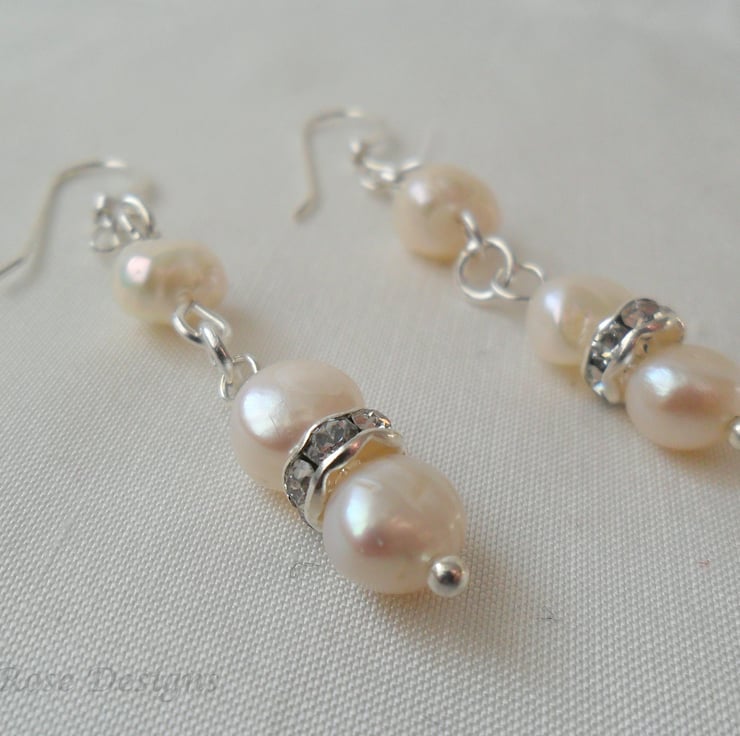 Lovely handmade earrings with ivory freshwater pearls and diamante rondellles. Hanging from Sterling Silver (925) ear wires they have a drop of 2" (5 cm). With their beautiful lustre and sparkling diamante these earrings are suitable for Weddings, Proms or any 'Occasion' where you want to feel special.
