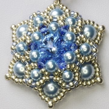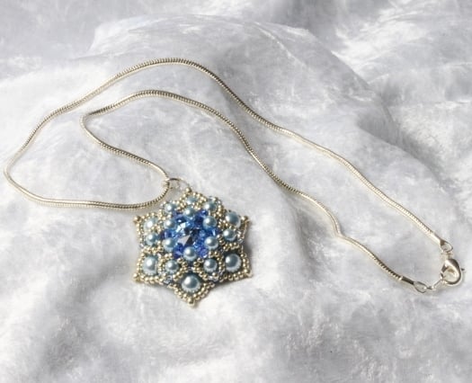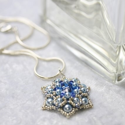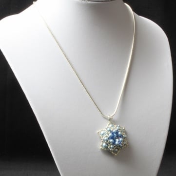This pretty pendant is in shades of sapphire and pale blue and complemented with little silver seed beads. The beautiful central rivoli is surrounded by tiny 3mm Swarovski crystals; both are a beautiful sapphire blue. The faceted shape of the 12mm rivoli gives it depth and sparkle whilst the 3mm crystals are alternated with pale blue Swarovski crystal ‘pearls’, simulated pearls with a good quality crystal core, which gives them the lustre of the real thing. Two more layers of the same coloured pearls are set in a network of silvery seed beads to complete the piece. The pendant is strung on a good quality 45.7cms(18inch) silver plated snake chain, with trigger clasp. The chain is 1.9mm thick and drapes beautifully. I use plated silver as it seems less inclined to tarnish than sterling silver but I am happy to change these fittings to sterling silver at extra cost if required. Please contact me before purchasing if you would like to consider this option as, depending on the length of chain you require, it could take me longer to source the chain and post the item.