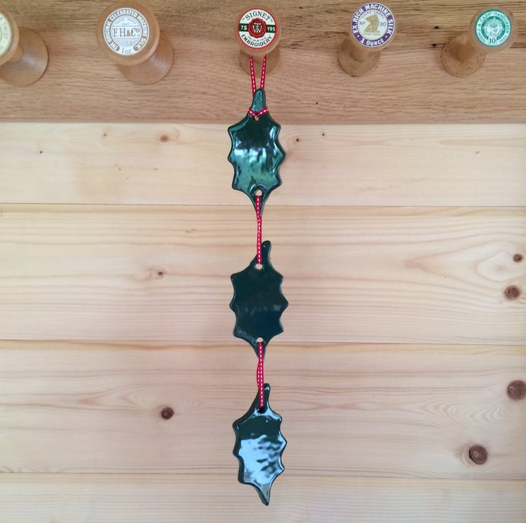 This ceramic triple holly hanger has been handmade using white earthenware clay making each one completely unique. The clay holly shapes were left to dry out at this stage before being kiln fired for the first time. After this initial bisque firing the holly shapes were hand painted with a rich green opaque glaze and decorative red accents, before being kiln-fired for the final time. They are then strung together vertically with co-ordinated ribbon, ready to adorn your festive home.