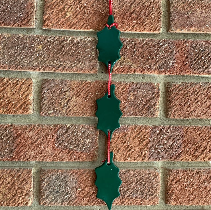 Each individual holly shape is approximately 4.5cm wide and 10cm tall. The total length including the ribbon is approx. 38cm.