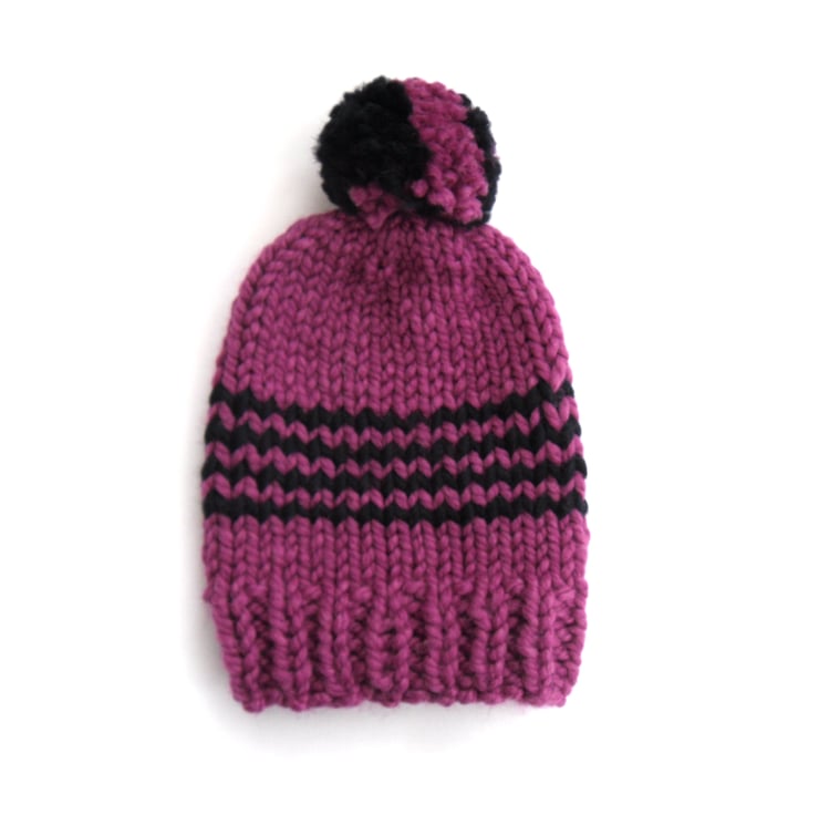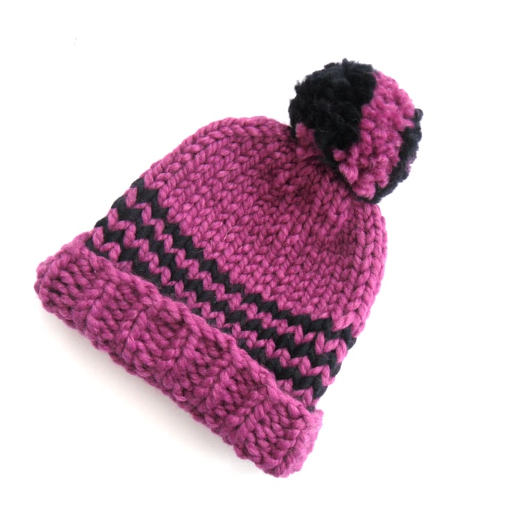 Cool trendy beanie hat. Striking Rhubarb pink with 4 navy blue stripes and a fun 2 coloured pom pom. Great for this coming winter. Will keep your head and ears super warm.