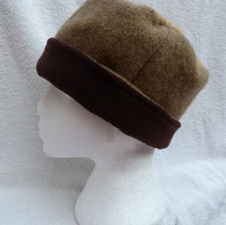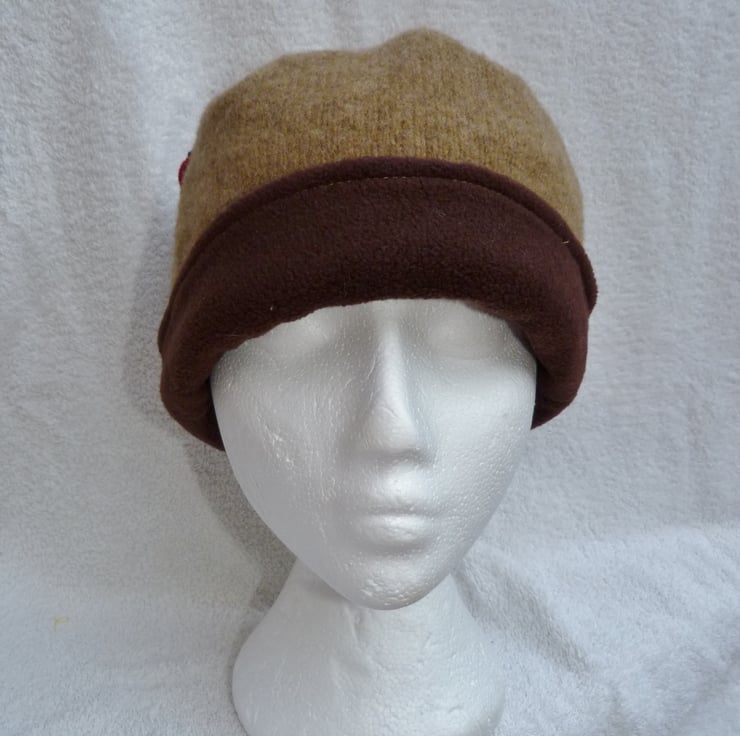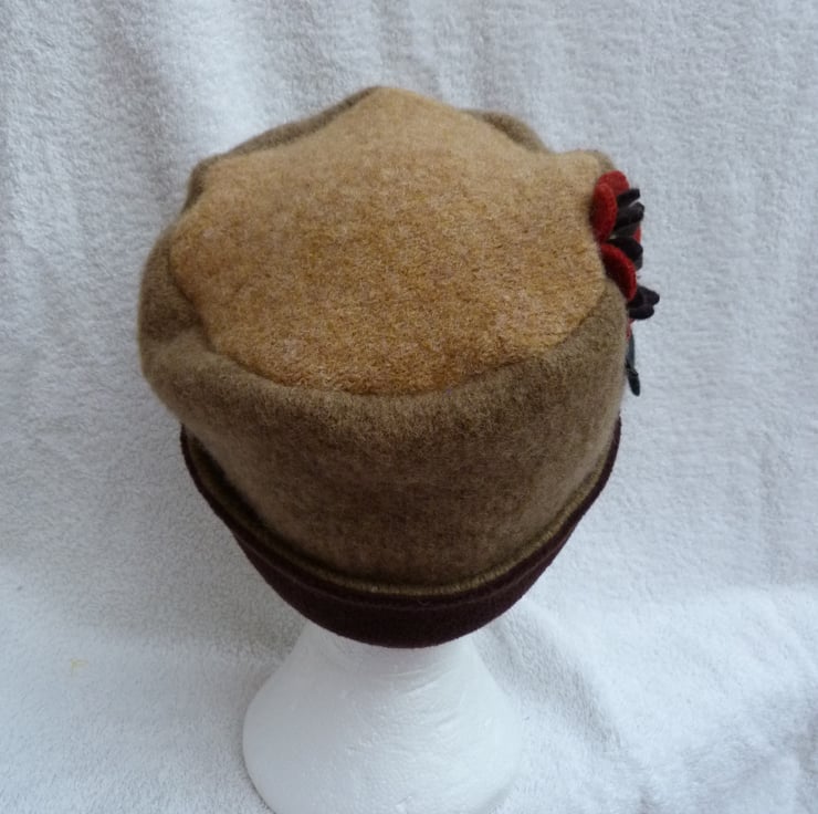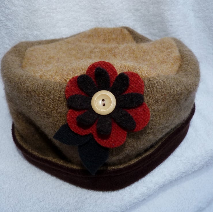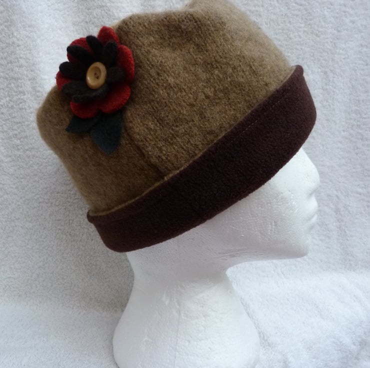 This stylish winter hat has been re-fashioned from up-cycled 100% wool sweaters. The jumpers have been washed and felted before stitching. A full lining for the hat has been made from polyester polar fleece for warmth and comfort. The brim folds up to show the fleece lining. A decorative felt flower with button center has been stitched to the brim of the hat.