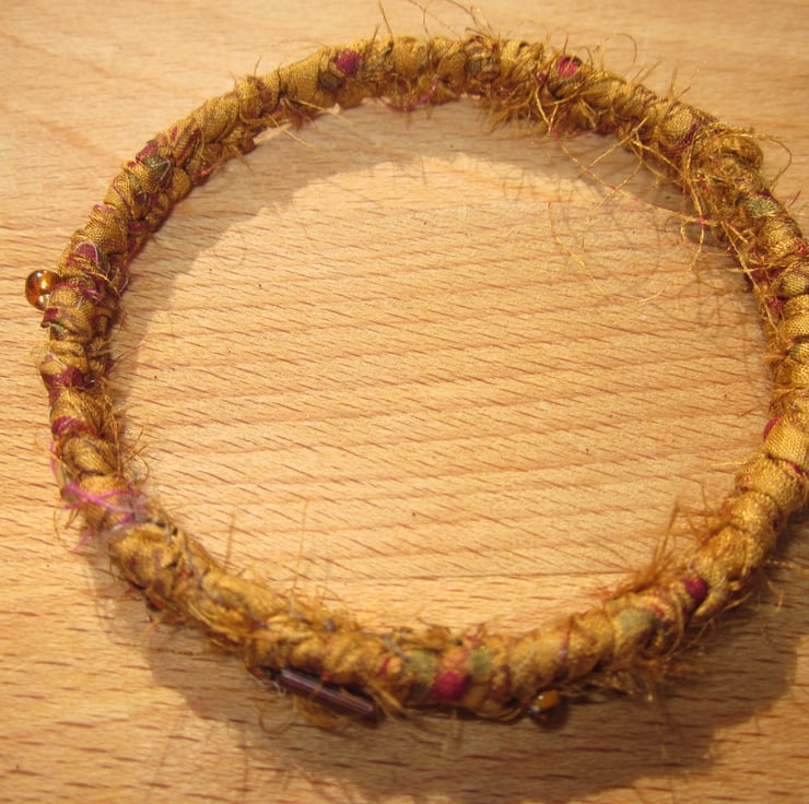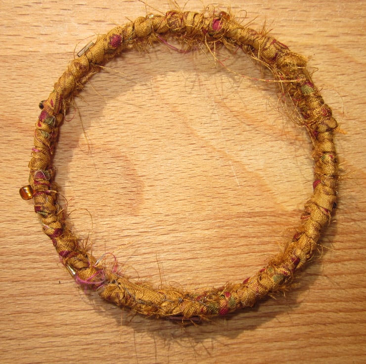 This textile bangle has been handmade using ribbon I have made myself from recycled silk saris. The ribbon was plaited around a solid metal base and then embellished with tiny co-ordinating glass beads.