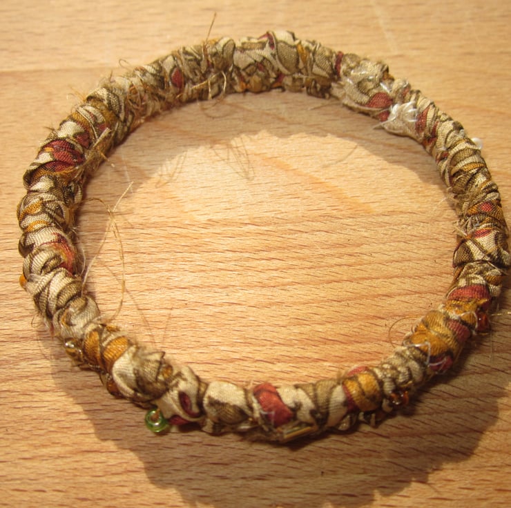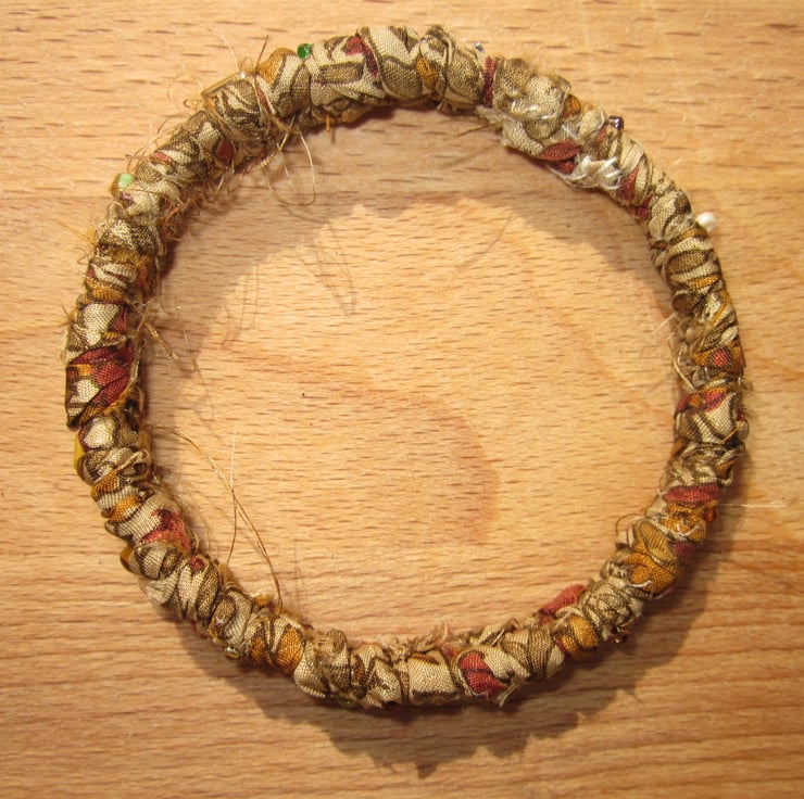 This textile bangle has been handmade using ribbon I have made myself from recycled silk saris. The ribbon was plaited around a solid metal base and then embellished with tiny co-ordinating glass beads.