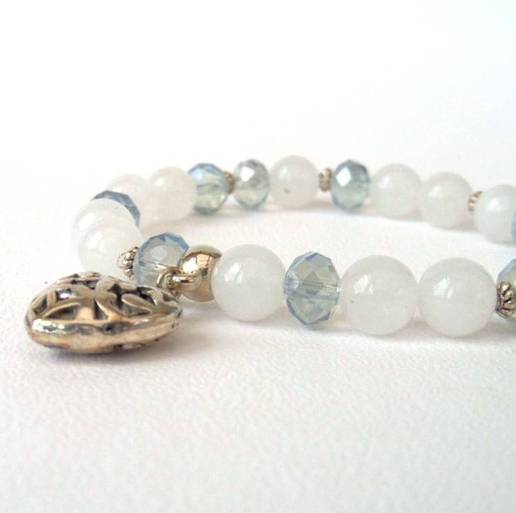 White jade and delicate blue crystals make a great combination in this stretchy bracelet.