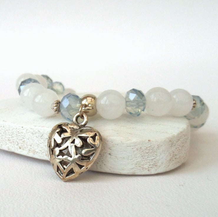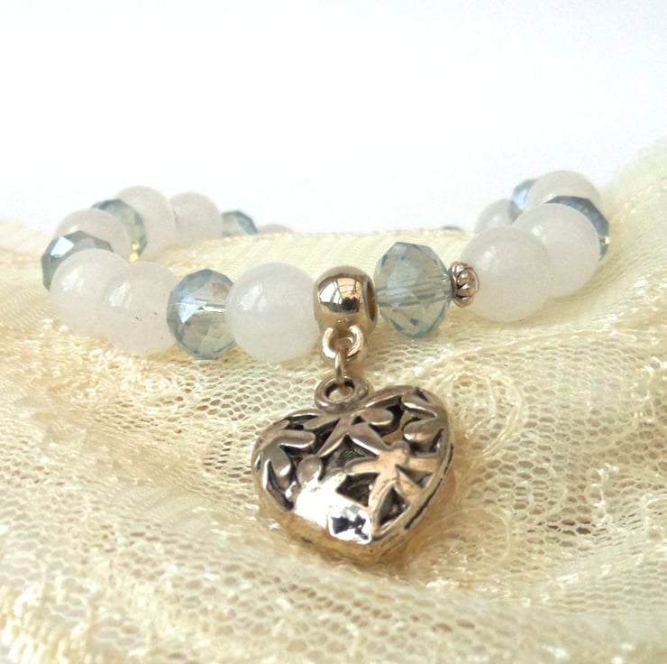 I have added some tiny tibetan silver beads between some of the jade and crystals to add additional detail, and completed the bracelet with an ornate silver coloured heart measuring approximately 15 x 15 mm.