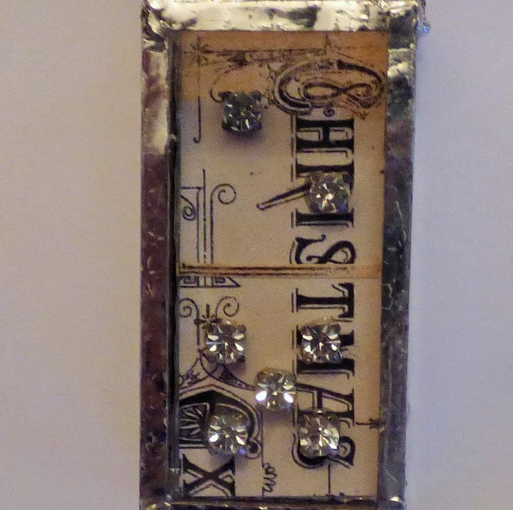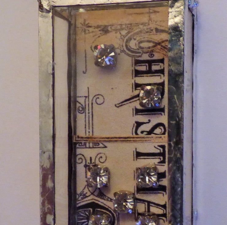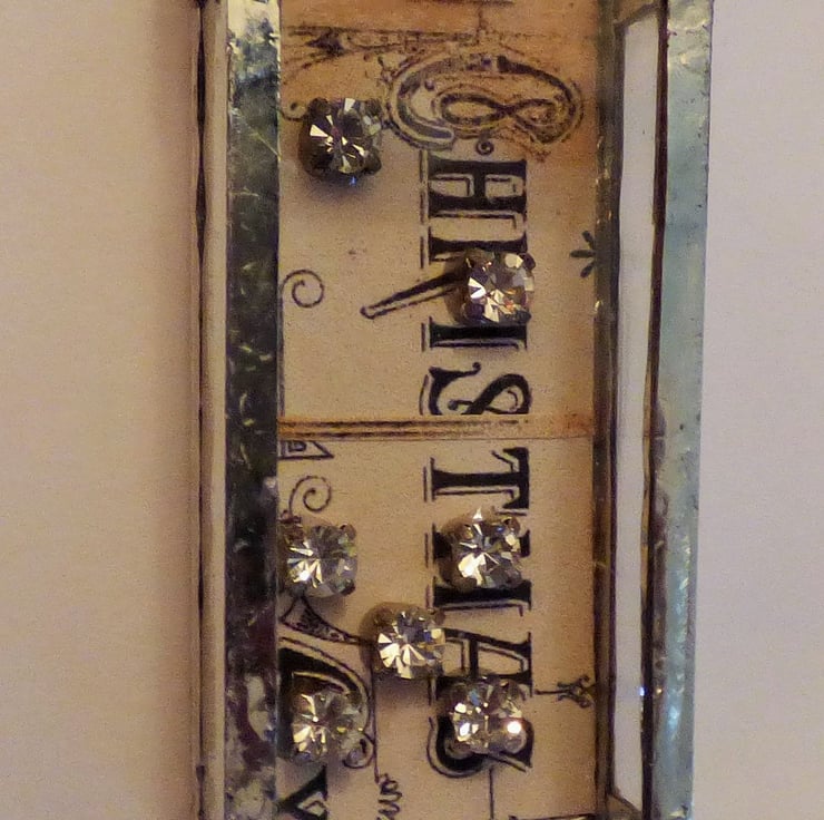 I hand soldered a glass box using lead free silver solder. The box measures 1"x 2"x.5". Inside is a backdrop of old text from a Xmas poster, I have made it look like a domino piece by arranging mounted diamantes into a 2 and a 5.