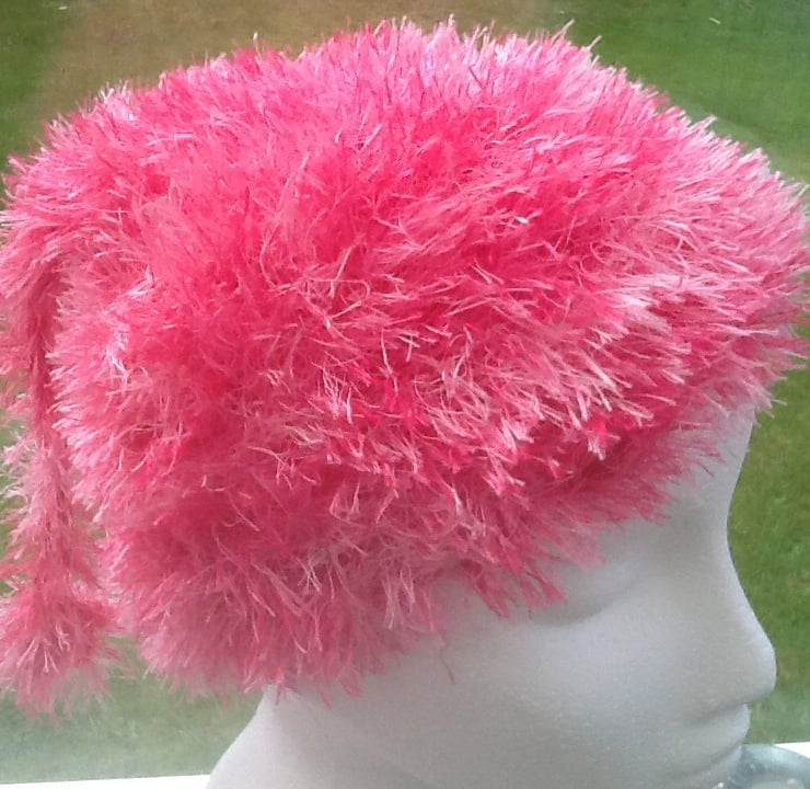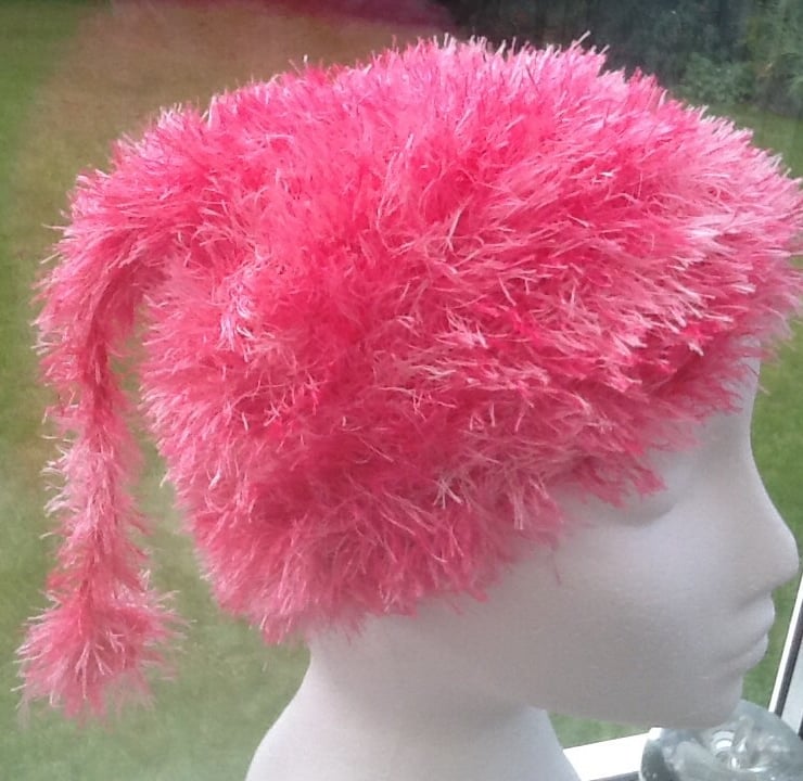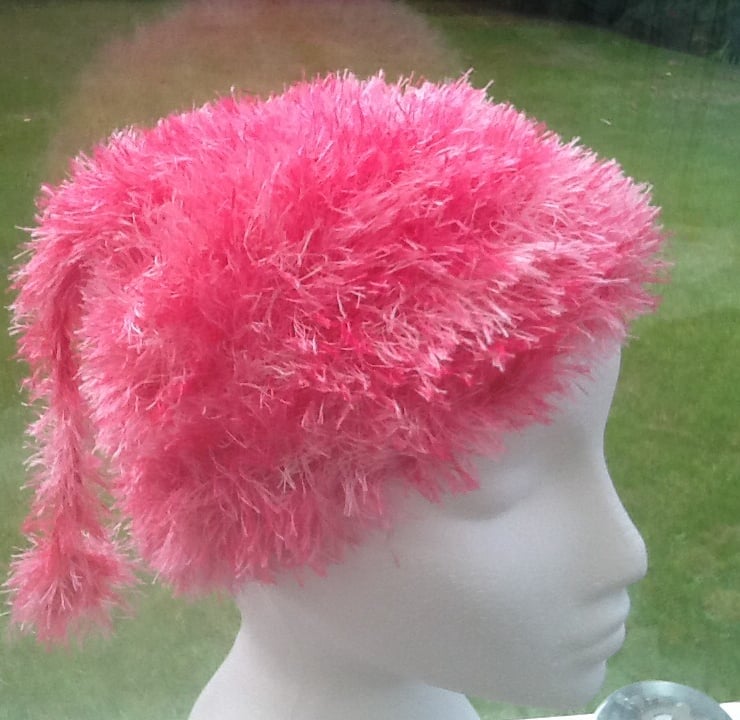 Fluffy Pixie! Is a cute little fantasy hat, in bright pink eyelash yarn, perfect for any little girl who love pink!