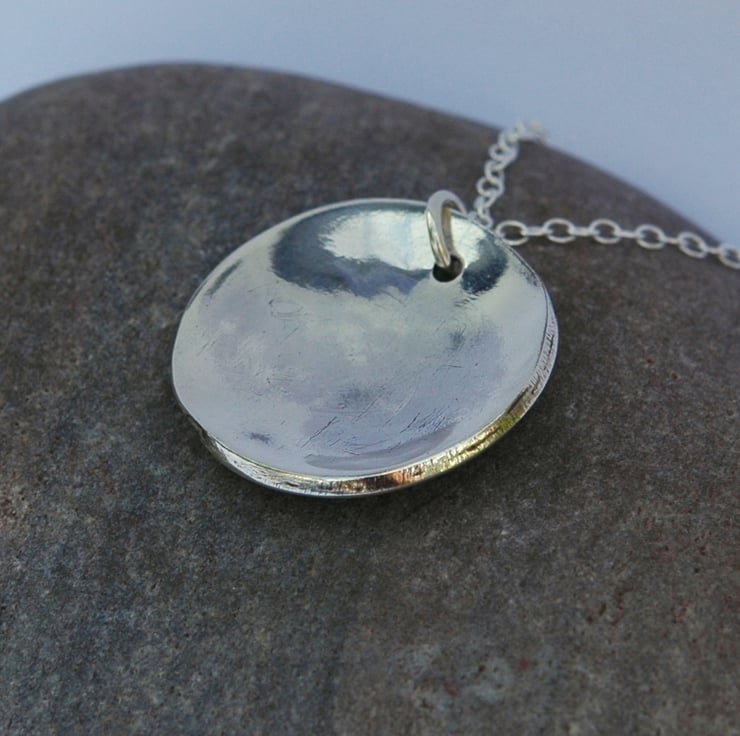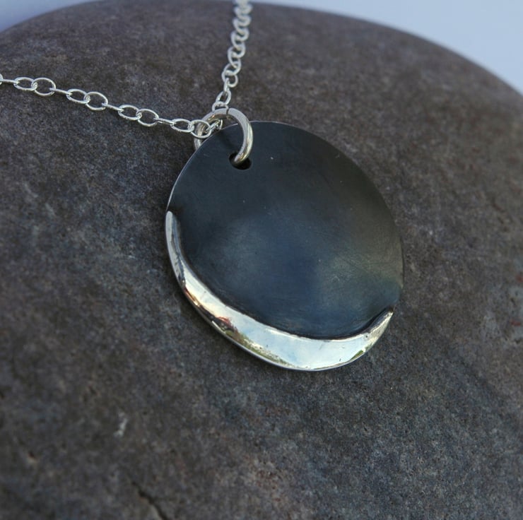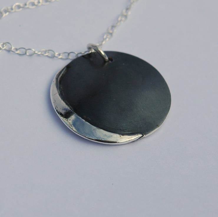 This unique pendant was designed to show the beauty of a crescent moon. I began with a circle of sterling silver sheet, 2.5cm wide. I used a piercing saw to cut a thin crescent of silver and soldered it to the circle. A doming punch was used to give the pendant a convex curve. The whole pendant was then immersed in oxidising solution to darken the surface before polishing the crescent and the reverse side to a bright shine. This is a two-in-one pendant, the reflective concave reverse side makes a very attractive jewellery item in its own right - see last photo.