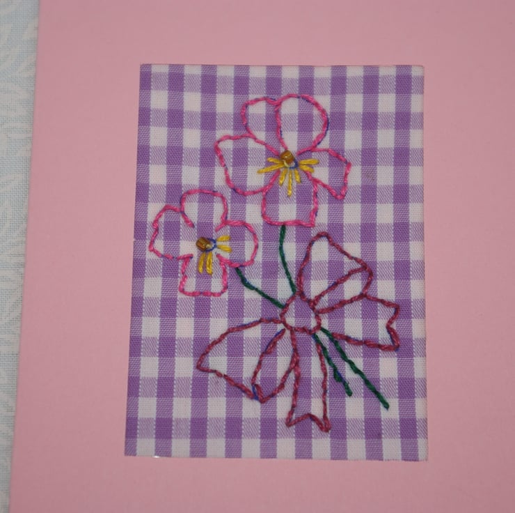 A hand embroidered flower card. This pretty little card of two crewel embroidered pink flowers onto the background of checked purple and white cotton fabric. Into the centre of each flower a amber colour glass bead has been sewn. The two pink flowers have a hand sewn bow of purple around their dark green stems.