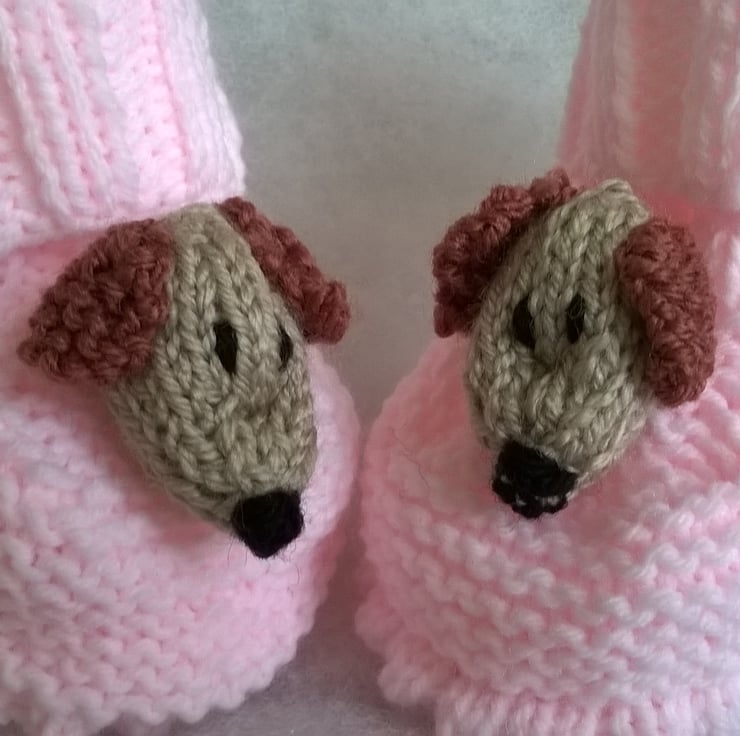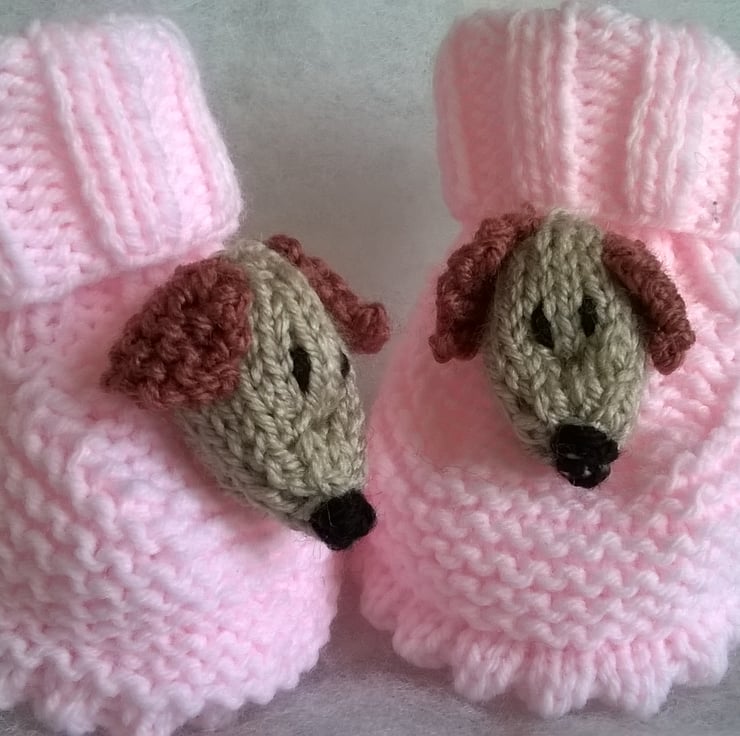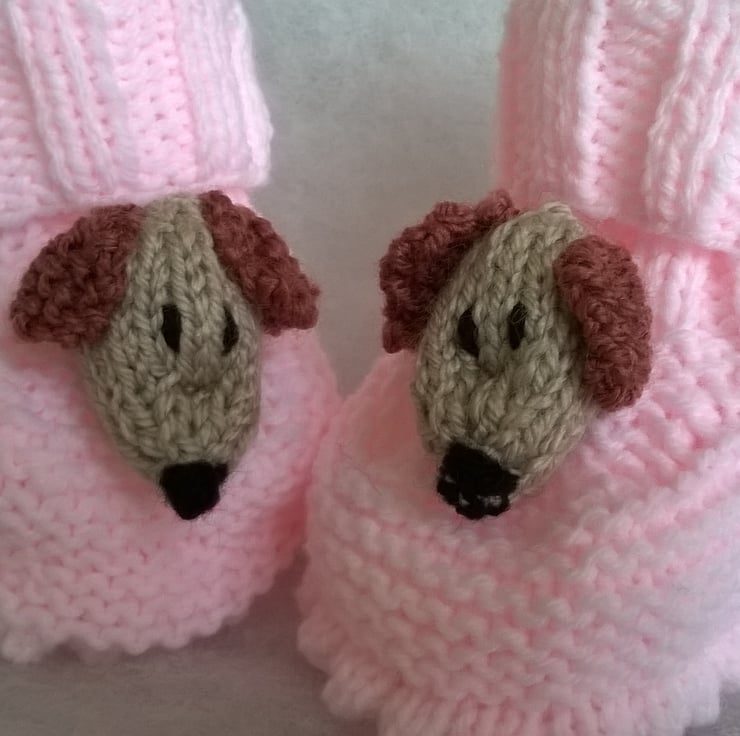 A sweet pair of baby booties hand knitted in soft Sirdar double knit wool with decorative picot edging.