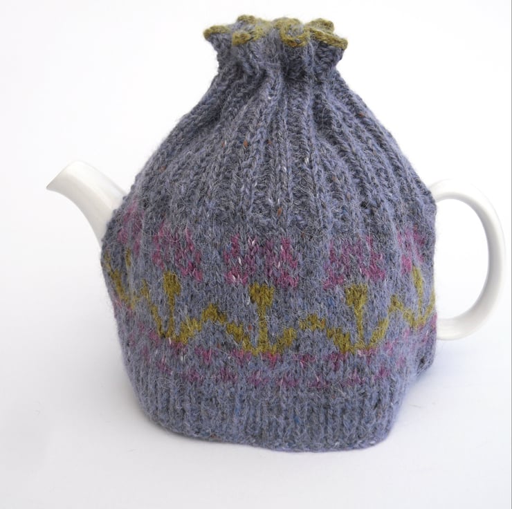 The tea cosy has been knitted in a light blue fair isle stitch depicting pink / purple a row of pretty pink flowers. It has a drawstring top , with a pink twisted wool threaded through.