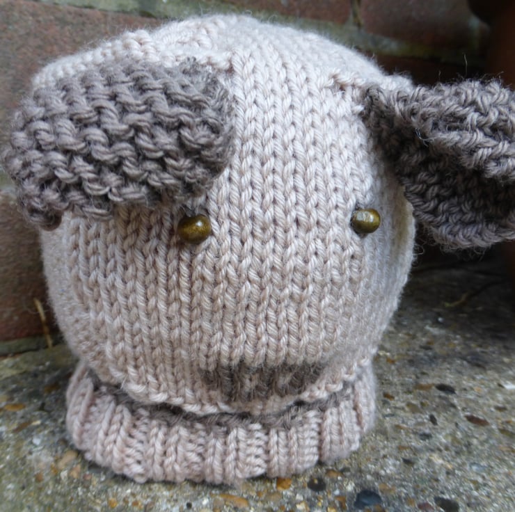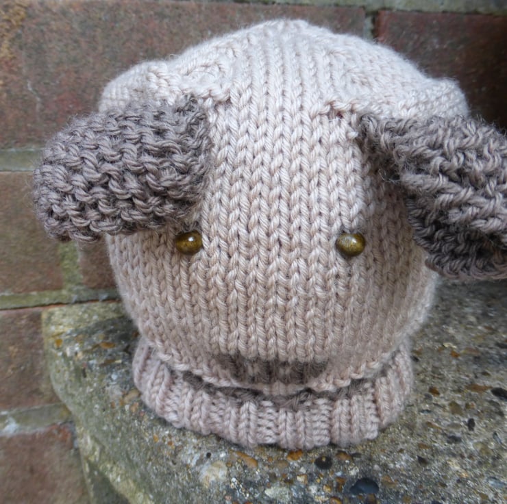 This cute Puppy Dog Hat has a ribbed brim and a reverse stocking stitch body with a stocking stitch face and crown. The nose is added using duplicate stitch, the eyes are beads or buttons and the ears are knit separately in garter stitch and sewn on upon completion. The hat is knit flat on two needles with a seam at the back.