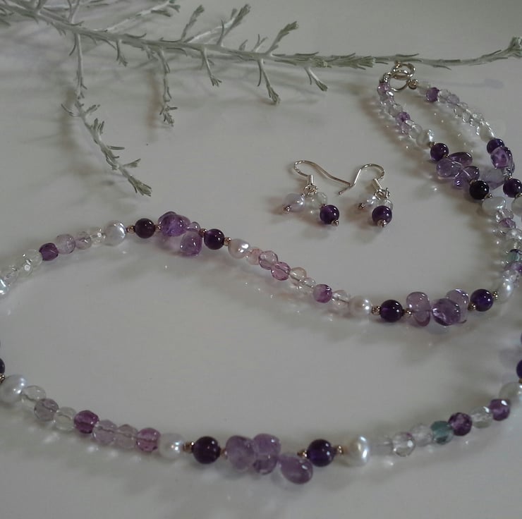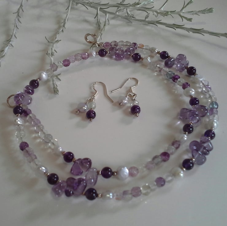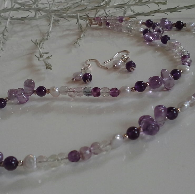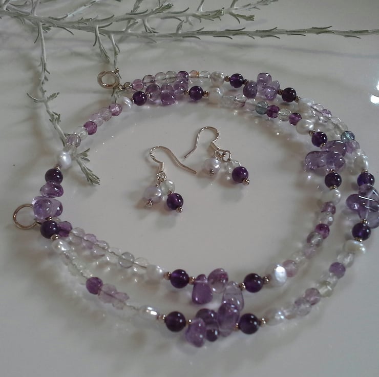 This lovely sweet necklace has been hand made using quality graduated amethyst drops and rounds, gemstones multi coloured Florite rounds complimented with pretty dainty fresh water cultured pearls and small 925 sterling silver spacer beads. This necklace comes with a matching pair of 925 sterling silver earings within the price. This set would make a lovely gift for those seeking quality jewellery on a strict budget.