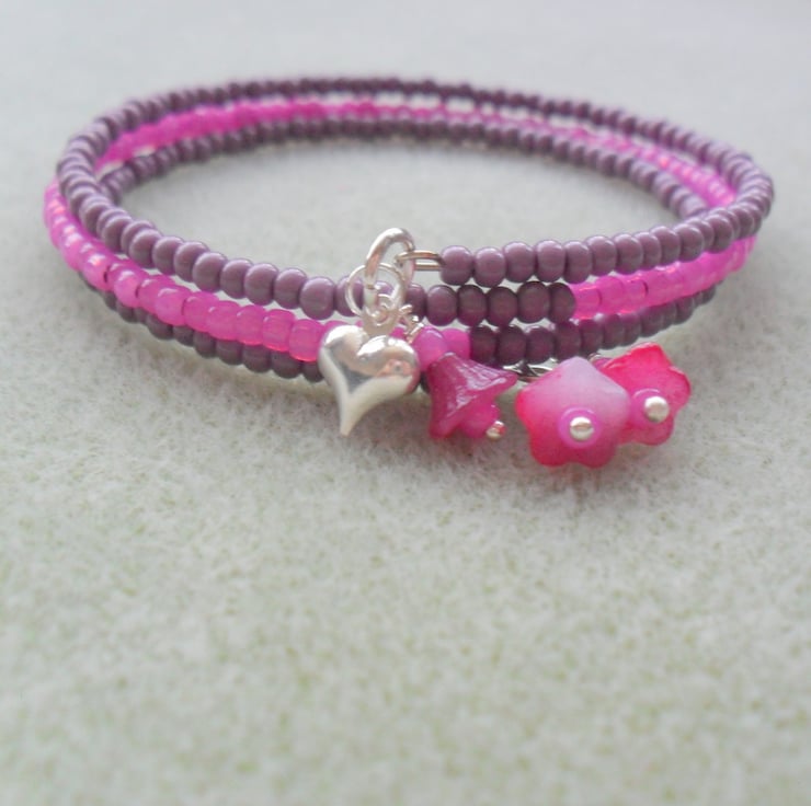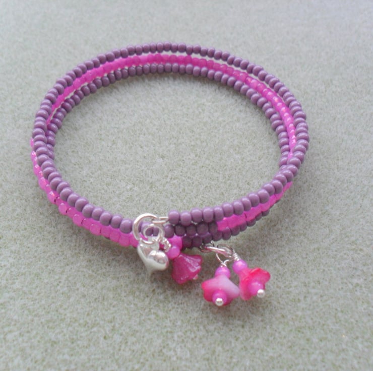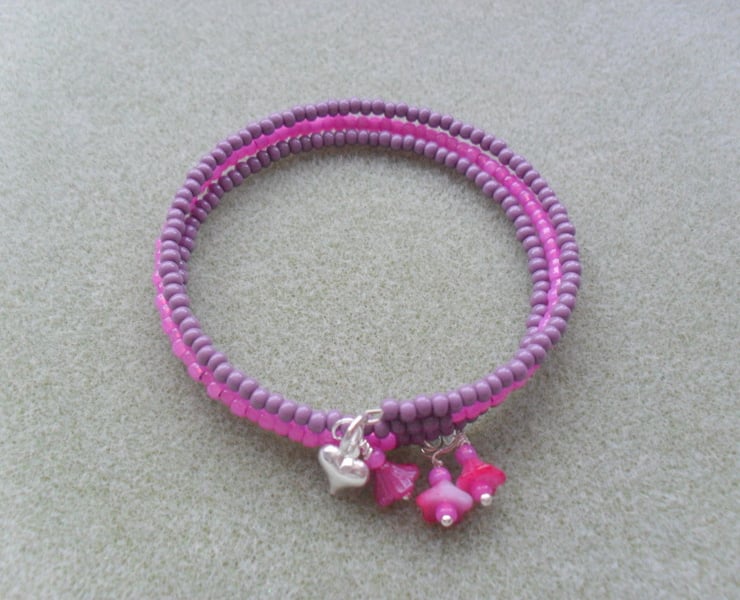 Bracelet has been made using mauve Czech glass and Toho bright pink seed beads which have been beaded onto memory wire