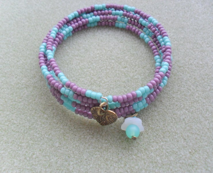 mauve and turquoise 3 mm seed bead memory wire bracelet