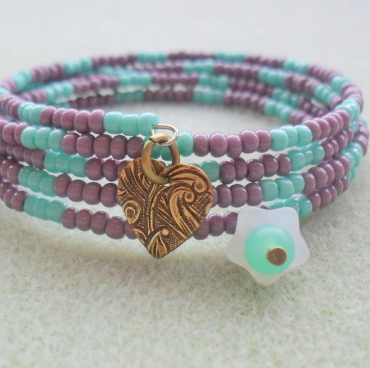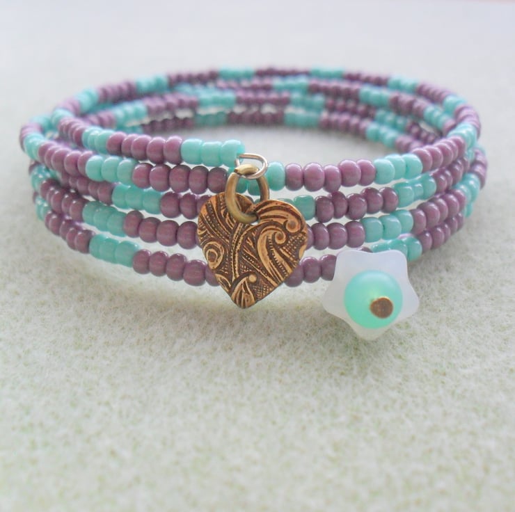 Bracelet has been made using mauve Czech glass and Toho turquoise seed beads which have been beaded onto memory wire