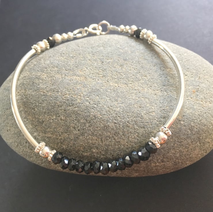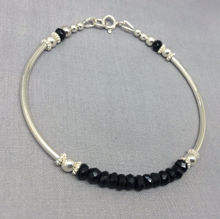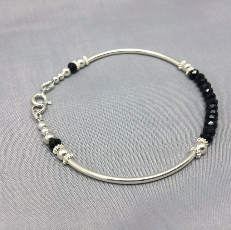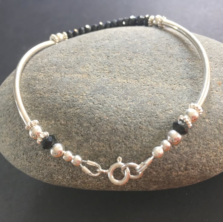 Black Spinel Sterling Silver Beaded Ball Bracelet Bangle - I made this bracelet with 4mm faceted black Spinel Gemstones and various sizes and styles of 925 Sterling Silver Beads and 925 Sterling Silver long 2mm curved tubes. I finished the bracelet with a Sterling Silver bolt ring clasp. I use premium 49 strand professional quality beading wire, which is very strong and flexible, I also finish all my beaded jewellery with Sterling Silver wire guards, which gives additional protection to the wire at the clasp area.