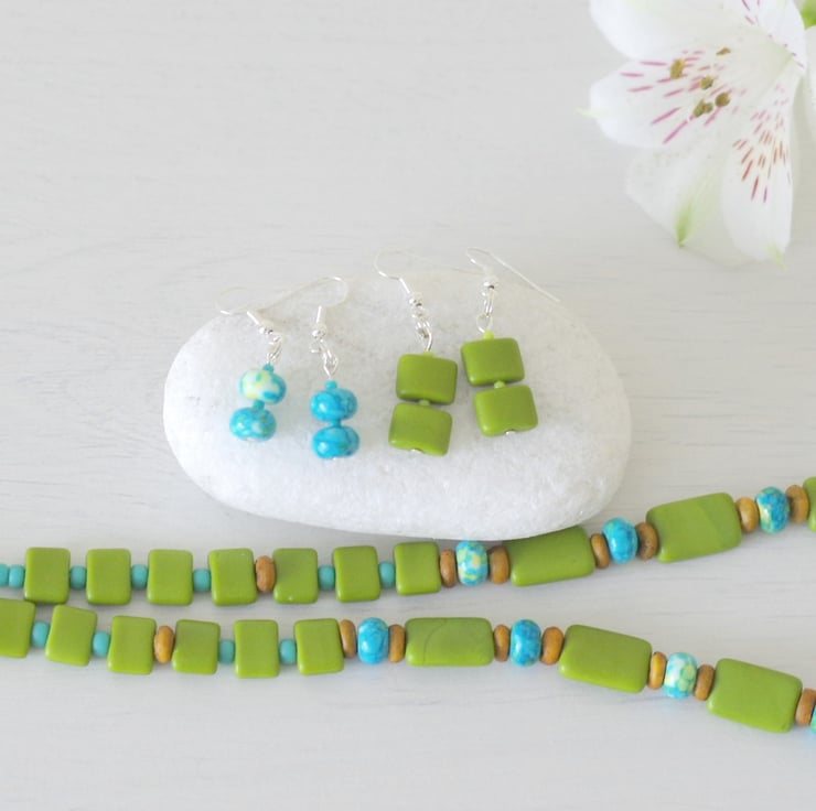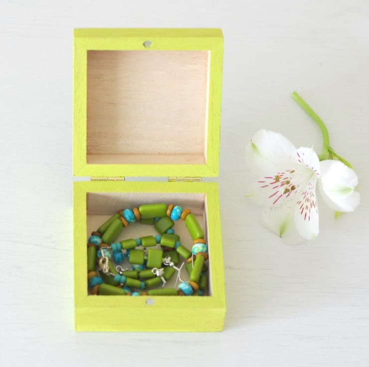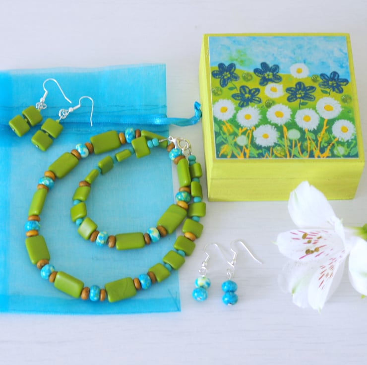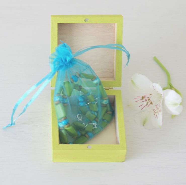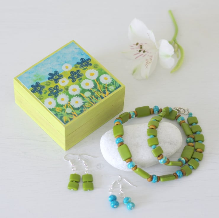 This jewellery set comes with its own trinket box hand painted by me and with an art print mounted on top. I made this wooden box by painting it in lime green acrylic paint. The daisy floral image is printed at home on 270 GSM artist satin paper and it is a print after one of my original paintings. For the jewellery set, I used lime green glass matte beads, turquoise gemstones and wooden beads. I made two pairs of earrings - one green and one turquoise - so you can mix and match them, depending on your outfit. The jewellery set also comes in a turquoise organza bag.