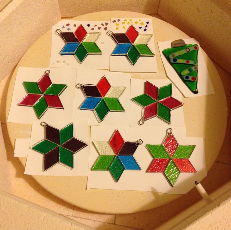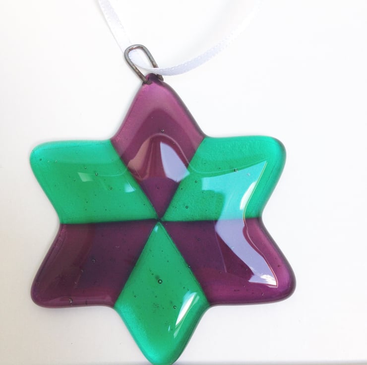 Made by handcutting 12 translucent glass diamond shapes and arranging in a star shape of two layers this hanging decoration has been kiln fused for 11hrs at 800 degrees Celcius. The process includes annealing to strengthen the glass to help avoid later breakage. Measuring approx 7cm point to point, and 5cm at its shortest width, the star is hung on white ribbon.
