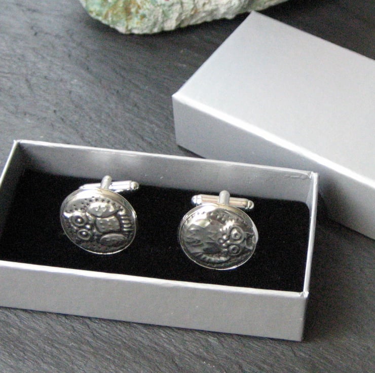 The Owl and the Pussycat cuff links hand crafted in pewter. These cufflinks have been individually handmade in shiny modern pewter, and feature the romantic pair from Edward Lear's rhyme. Each link measures 21mm across. They are presented in a smart grey gift box and would be a perfect present for a man for a 10th Wedding Anniversary, Wedding, Birthday or Christmas.